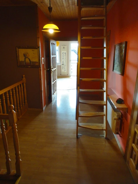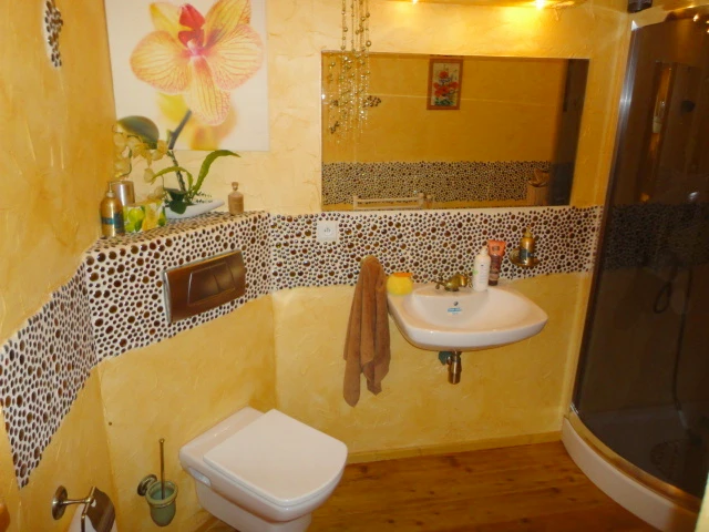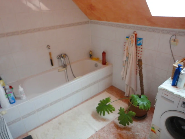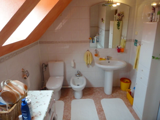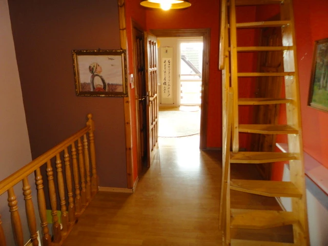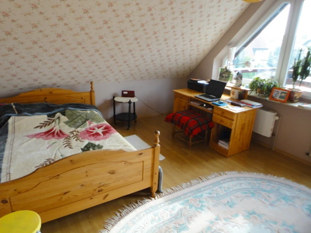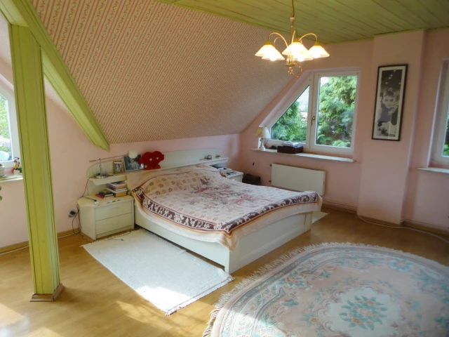 Im Obergeschoss erwarten Sie vier behagliche Schlafzimmer mit Größen von 12, 11, 21 und 14 m². Ein modernes Badezimmer (7 m²), ein Hauswirtschaftsraum und ein Flur mit Zugang zum ausgebauten Dachgeschoss bieten zusätzlichen Komfort. Die Böden sind mit hochwertigen Paneelen ausgestattet, die Wände glatt verputzt und frisch gestrichen.