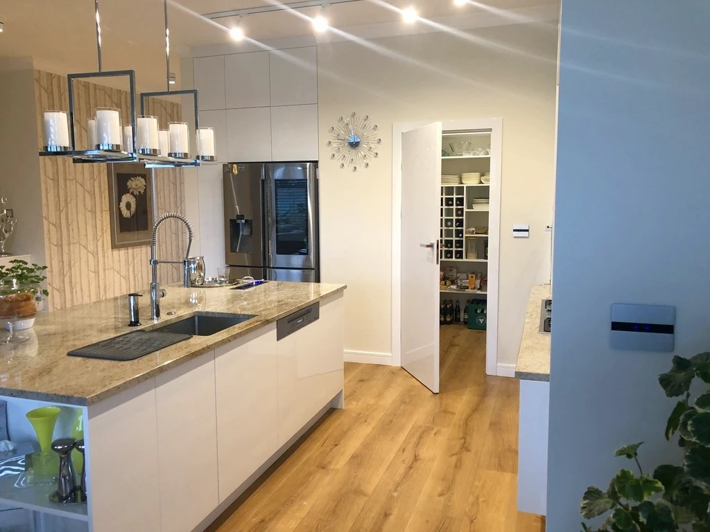 - Offene, maßgefertigte Küche mit Hochglanzfronten, granitener Arbeitsplatte und Griffsystem Blum