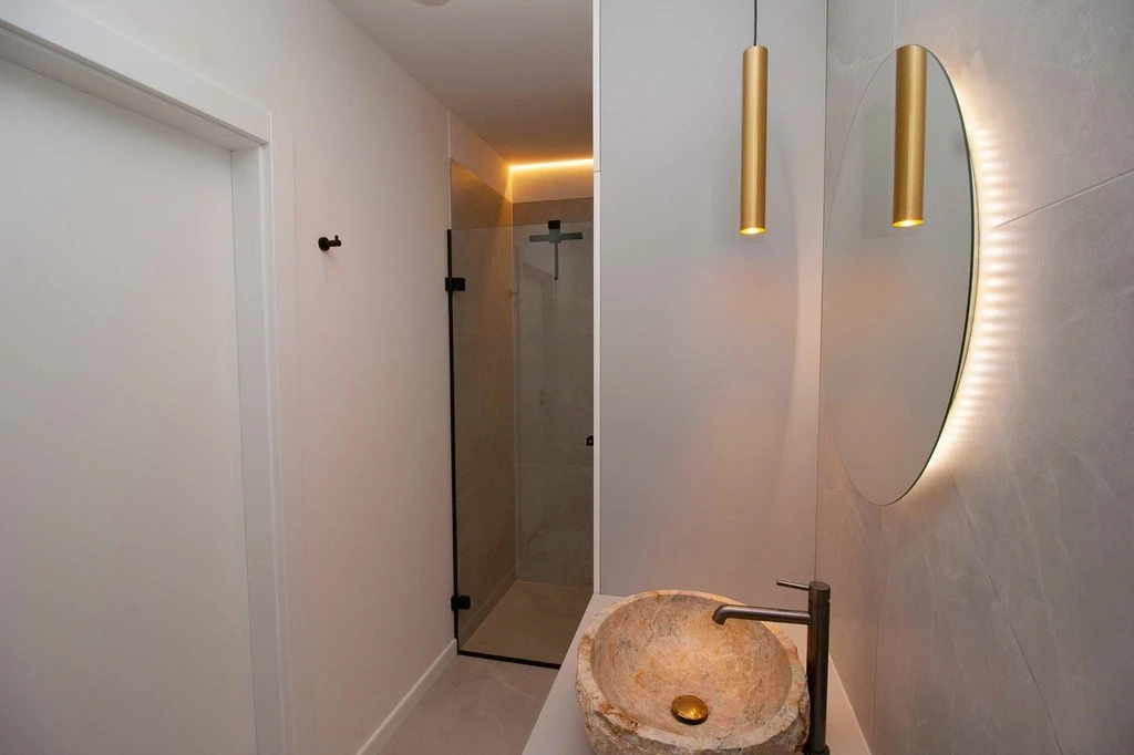 - Komplett ausgestattete Küche: Maßgefertigte Einbauküche mit hochwertigen Markengeräten: Kühlschrank, Geschirrspüler, Gasherd, Backofen. Zusätzlich ausgestattet mit einem Wasserfilter und einem integrierten Abfallzerkleinerer im Spülbecken.
