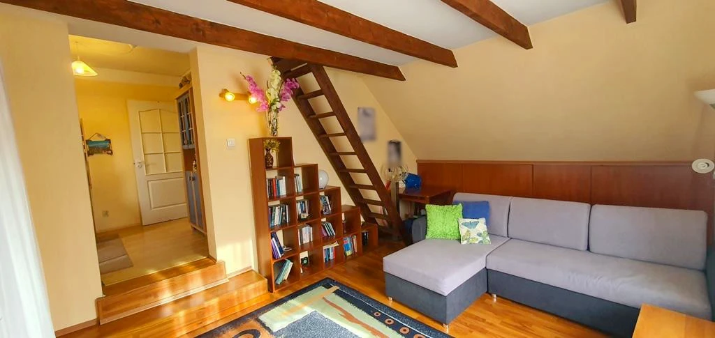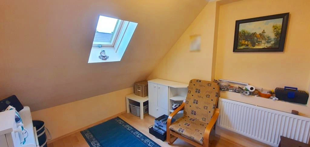 Obergeschoss: - Drei Schlafzimmer, darunter ein großzügiges Zimmer bestehend aus einem Wohnbereich mit Sofa und TV sowie einem anschließenden Arbeitsbereich. - Badezimmer mit Badewanne, Toilette und Waschmaschine. - Begehbarer Kleiderschrank. - Teilweise überdachte Terrasse mit Zugang aus dem Obergeschoss. - Vom Wohnzimmer im Obergeschoss führt eine Treppe zu einem ausgebauten Dachboden mit zusätzlichem Schlafbereich.