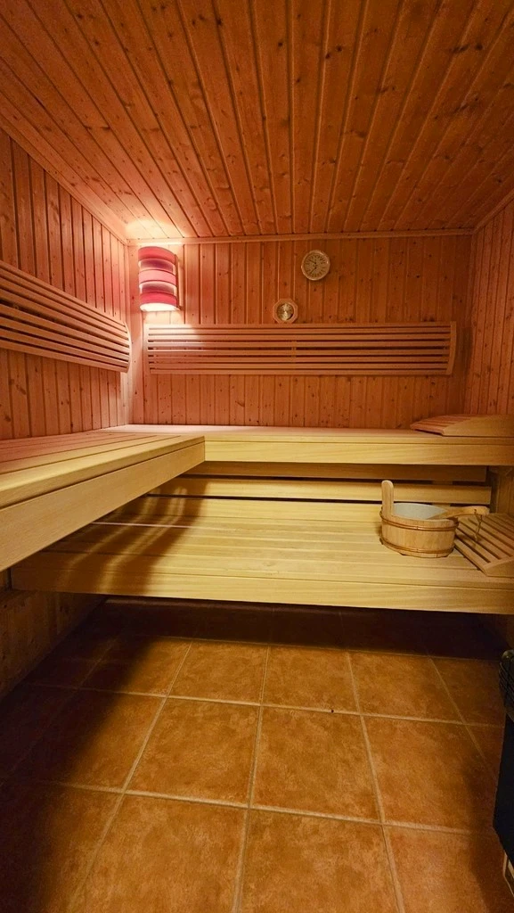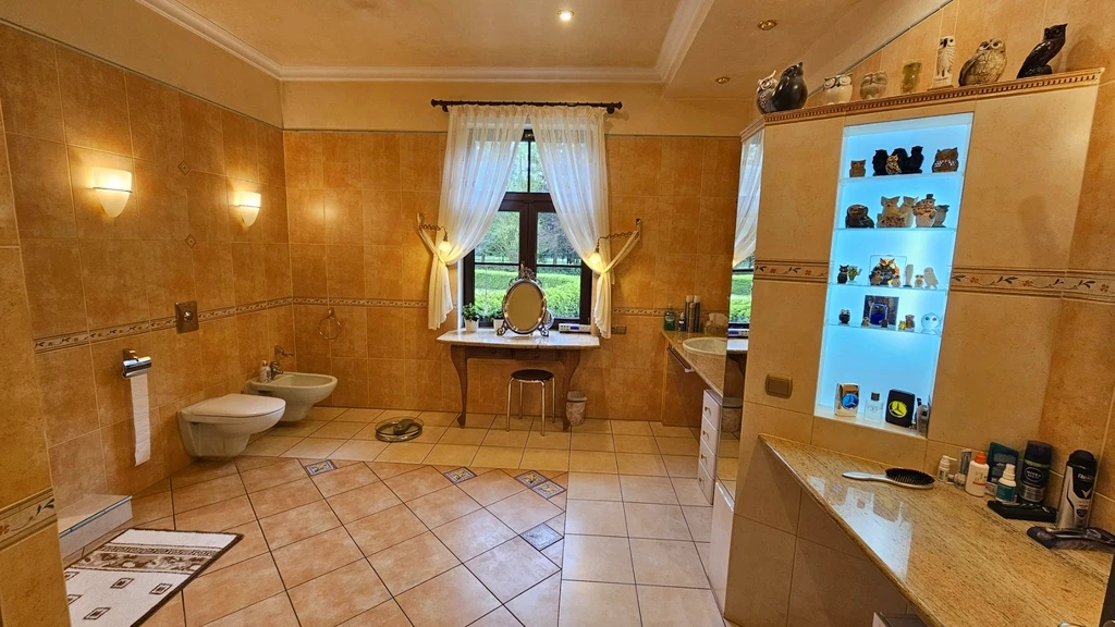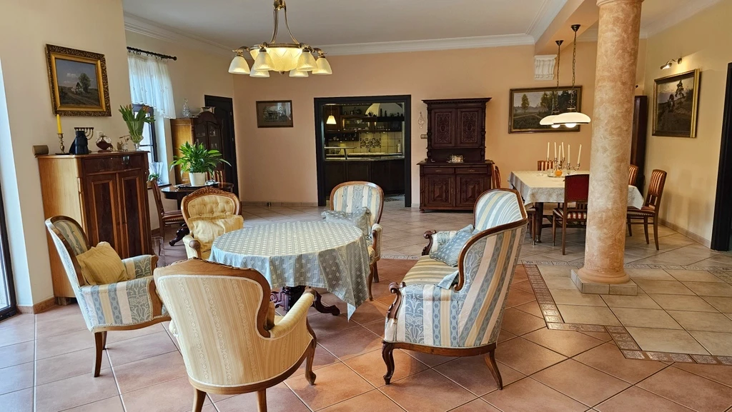 Die durchdachte Raumaufteilung umfasst: - Großer Eingangsbereich - 3 Schlafzimmer - 3 Badezimmer mit Dusche, Badewanne, WC, Bidet, Waschtisch, Fenster und Heizkörper - Separates Gäste-WC - Geräumige, separate Küche mit Vorratskammer - Esszimmer - Hauswirtschafts- und Abstellräume - Waschküche - Wellnesszimmer mit Sauna - Wintergartenähnliches Wohnzimmer (113 m²) mit Kamin und großflächiger Panorama-Schiebetür (HS-System) zum Sonnenterrasse (80 m²) - Doppelter Kamin – innen und außen mit Grillfunktion - Garage für drei Fahrzeuge mit Wartungsgrube
