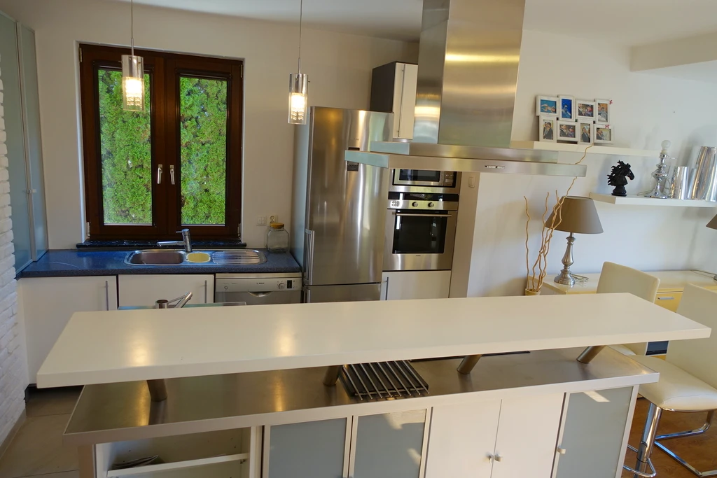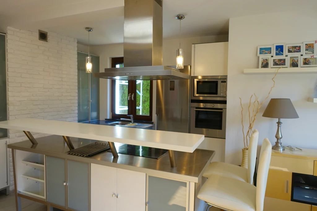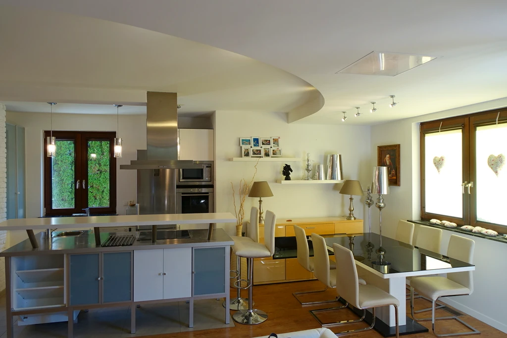 Das Herzstück des Hauses bildet der großzügige Wohnbereich mit offenem Kamin, Küche und Essbereich – insgesamt ca. 55 m². Die helle, offene Küche ist mit hochwertigen Einbaugeräten der Marken Bosch und Siemens ausgestattet, darunter Kühlschrank mit Gefrierfach, 60 cm Geschirrspüler, Cerankochfeld, Backofen und Mikrowelle.