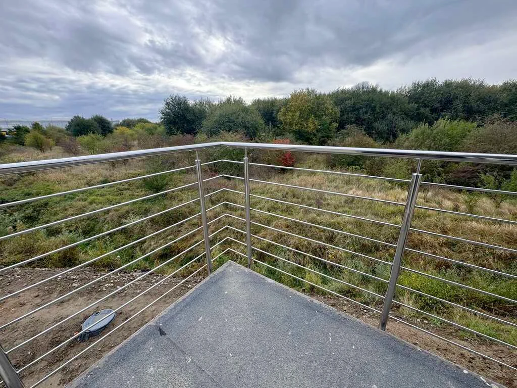 - Großflächige Süden-Terrasse mit Edelstahlgeländer auf Isokorb-Konstruktion