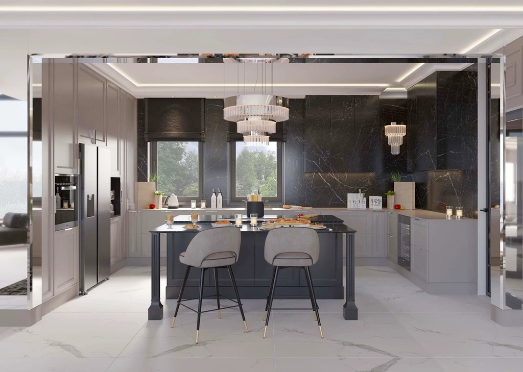 - Großzügiger Wohnbereich mit fast 7,30 m Deckenhöhe, Panoramafenstern und einem zweiseitigen Kamin, der Wohn- und Esszimmer stilvoll miteinander verbindet. Ein offener Grundriss bringt Licht und Weite in den Raum.
