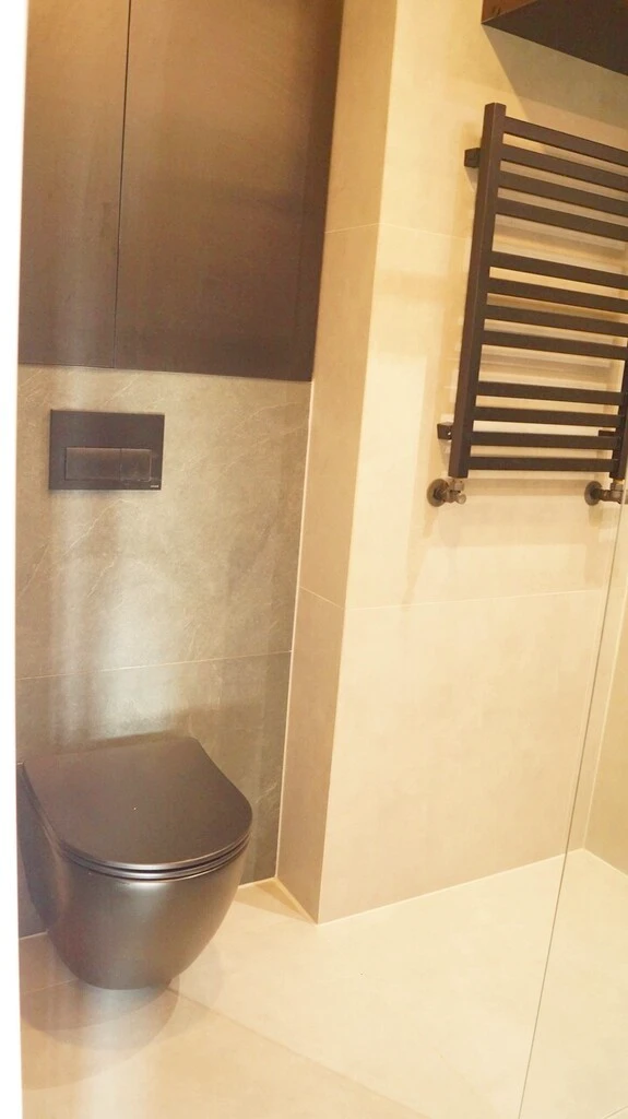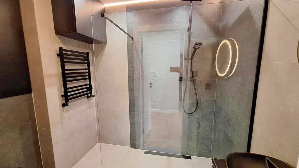 Die moderne, hochwertig ausgestattete Dusche, stilvolle Fliesen und zeitgemäßes Design sorgen für ein elegantes und funktionales Badezimmerambiente. -