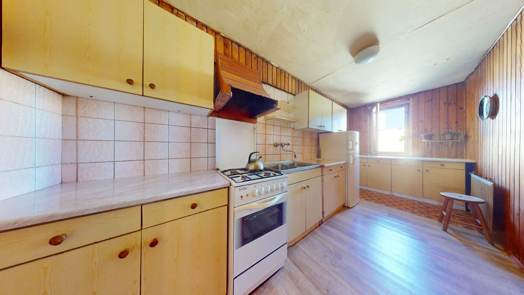 Die Wohnräume verfügen über zwei Heizsysteme: Der vordere Teil wird durch eine neue Gastherme beheizt, im anderen Teil wurde die Gasinstallation vorbereitet und zusätzlich ein traditioneller Kachelofen erhalten – ideal, um dem Raum eine besondere Atmosphäre zu verleihen.