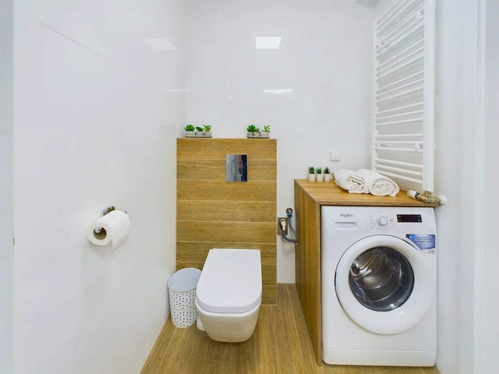 Komplett ausgestattetes Badezimmer mit stilvollem Interieur, hochwertiger Sanitärkeramik und praktischer Dusche.