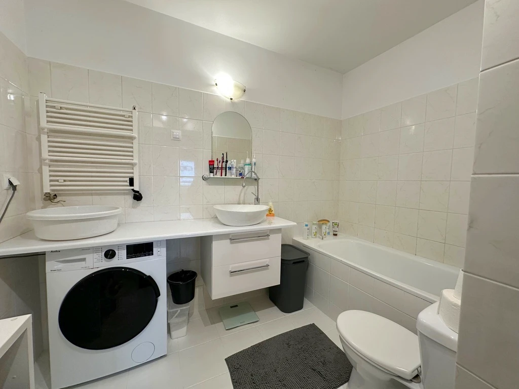 Zudem gibt es ein geräumiges Badezimmer mit Badewanne und Waschmaschine, das Komfort und Funktionalität vereint.