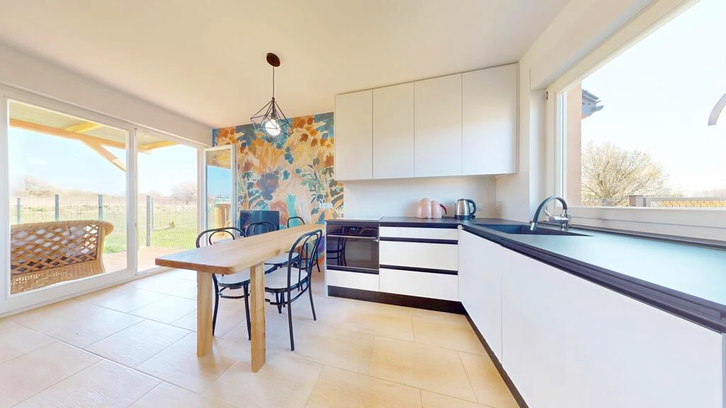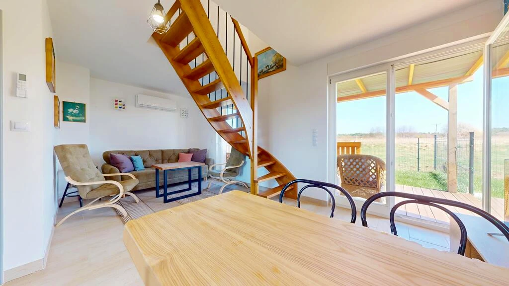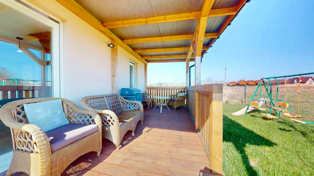 Dieses modern gestaltete, im Jahr 2023 erbaute Ferienhaus bietet höchsten Wohnkomfort in einer ruhigen und naturnahen Umgebung. Die Immobilie präsentiert sich in einem idealen Zustand – sowohl optisch als auch technisch – und wurde mit hochwertigen Materialien erbaut, insbesondere massiven Ziegelwänden, die eine langlebige und energiesparende Bauweise gewährleisten.