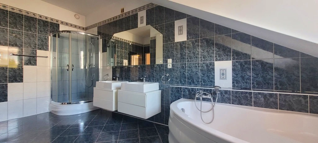 - Großzügiges Tageslichtbad mit Badewanne, Dusche, zwei Waschbecken, Bidet und WC