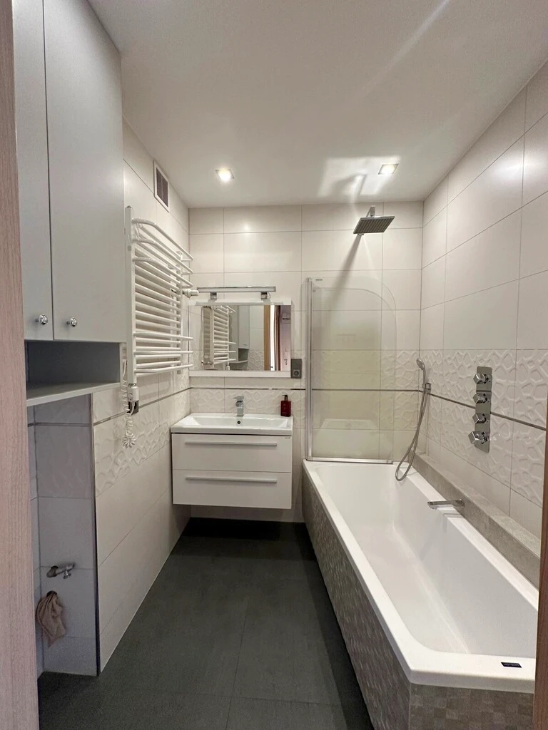 Modernes Badezimmer mit Badewanne – stilvoll gefliest und in sehr gutem Zustand.