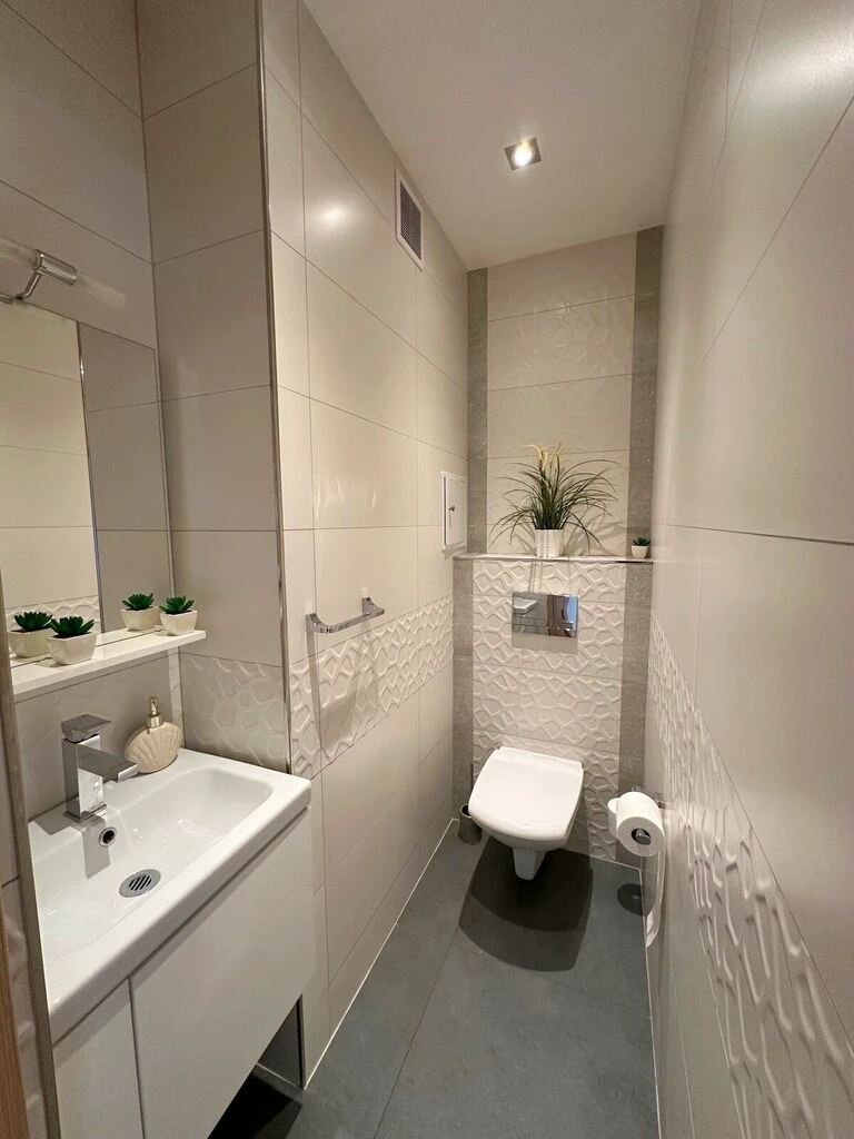 Separates WC – im selben modernen Design wie das Bad und mit zusätzlichem Waschbecken ausgestattet.