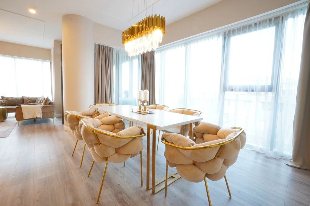 Das Herzstück des Apartments ist der offen gestaltete Wohnbereich. Dieser teilt sich stilvoll in eine gemütliche Lounge-Zone und einen Essbereich mit moderner Küchenzeile. Die geschmackvolle Beleuchtung unterstreicht das moderne Ambiente und schafft eine angenehme Atmosphäre.