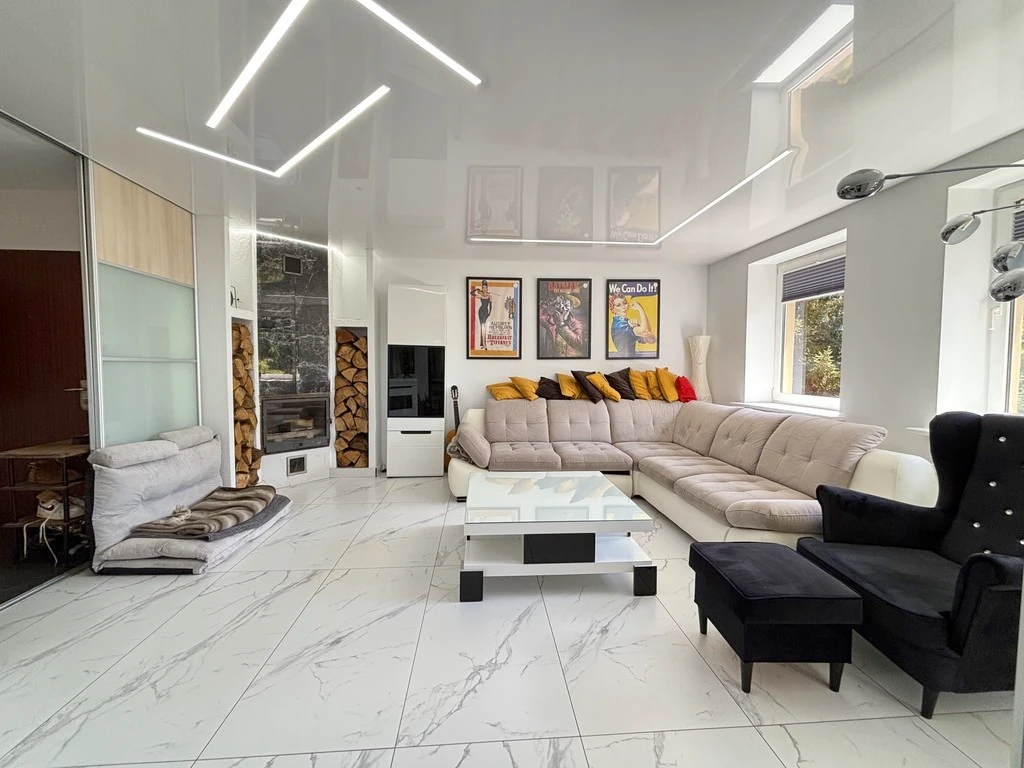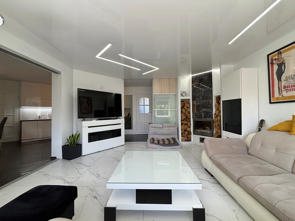 Das Wohnzimmer verfügt über einen gemütlichen Kamin sowie über einen großen, überdachten Balkon mit viel Platz für Sitzmöbel. Auf dem Boden wurde hochwertiger Feinsteinzeug verlegt, die Wände sind glatt verputzt und gestrichen. Die abgehängte Decke ist mit energiesparender LED-Beleuchtung ausgestattet.