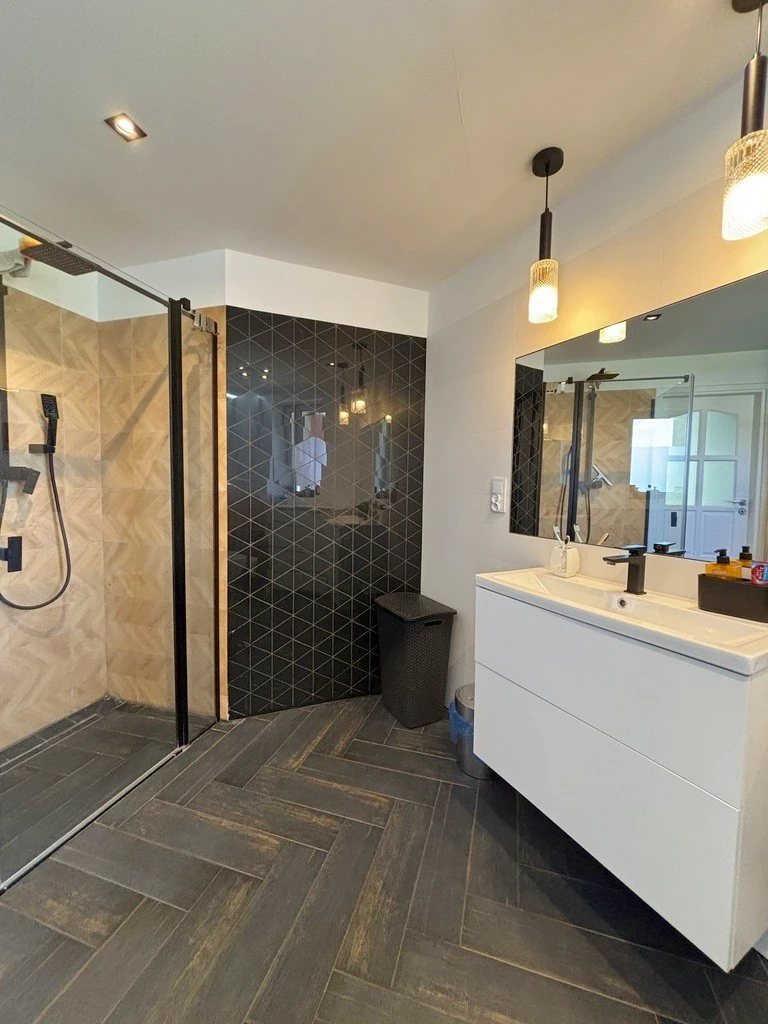 Das Badezimmer wurde im Jahr 2023 komplett renoviert und bietet eine moderne Ausstattung: Dusche, Waschbecken, WC, Handtuchheizkörper, Bidet sowie ein Fenster für natürliche Belüftung. Wände und Boden sind mit stilvoller Keramik gefliest.