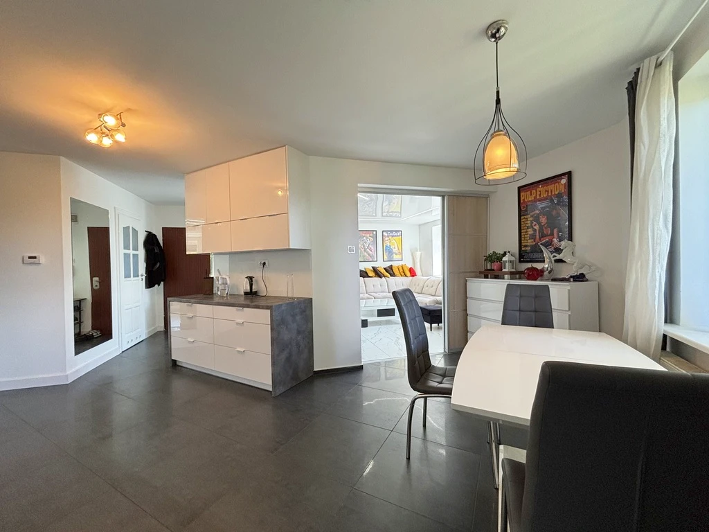 Die geräumige Küche ist offen gestaltet und mit dem Essbereich verbunden. In der Küche ist moderner Lacobel-Glasfliesenbelag verbaut, im Essbereich glatte, gestrichene Wände. Der Boden ist ebenfalls mit Feinsteinzeug gefliest.