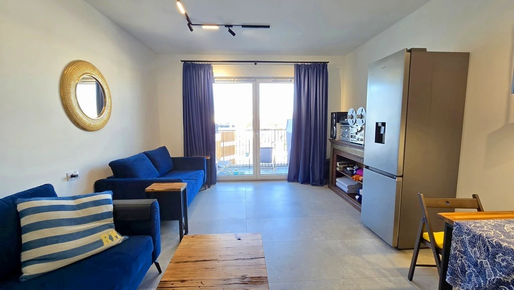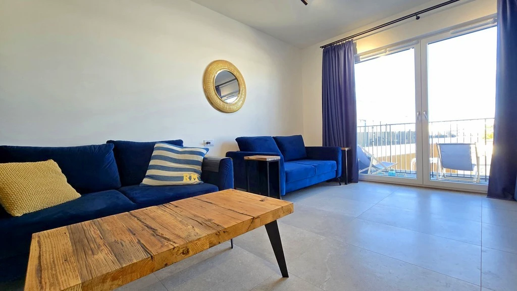 Die Wohnung verfügt über ca. 30 m² Wohnfläche und bietet dank großer Fensterfronten viel Licht und einen schönen Blick in Richtung Meer. Der großzügige Wohnbereich ist mit einer modernen, maßgefertigten Küchenzeile ausgestattet und bietet direkten Zugang zu einer ca. 6 m² großen Terrasse – perfekt für ein Frühstück mit Blick in die Ferne oder entspannte Abende.