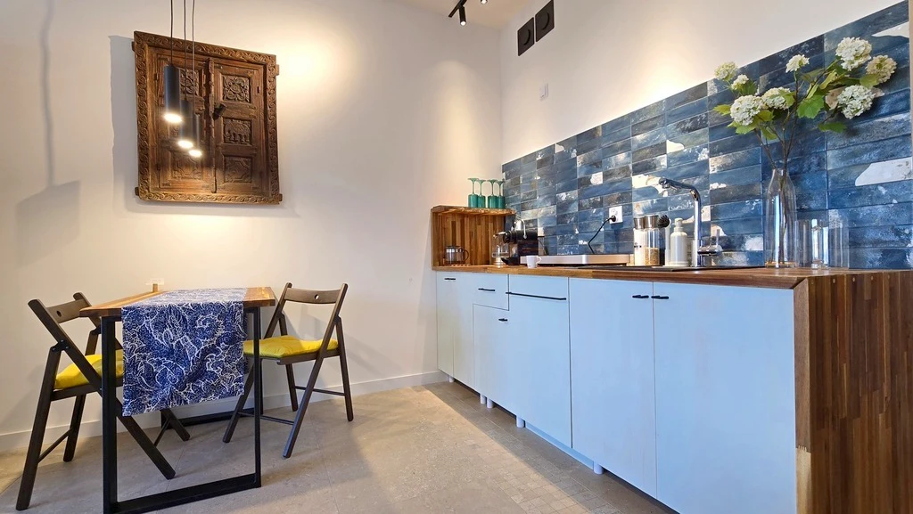 Das Apartment ist hochwertig eingerichtet – italienische Boden- und Wandfliesen (Feinsteinzeug) im gesamten Bad und Wohnbereich, maßgeschneiderte Küchenmöbel sowie stilvolle Einrichtungselemente sorgen für ein exklusives Wohngefühl.