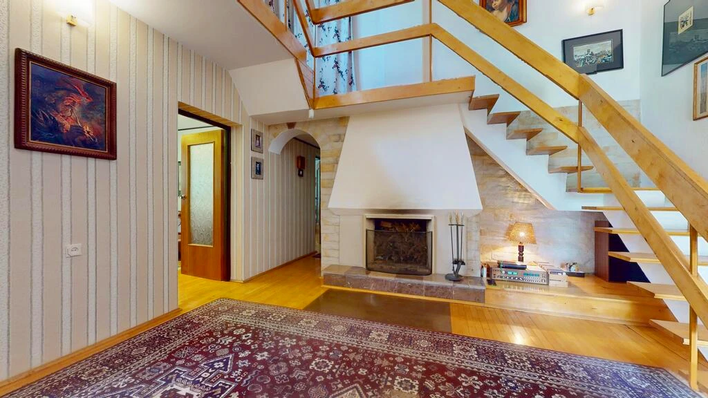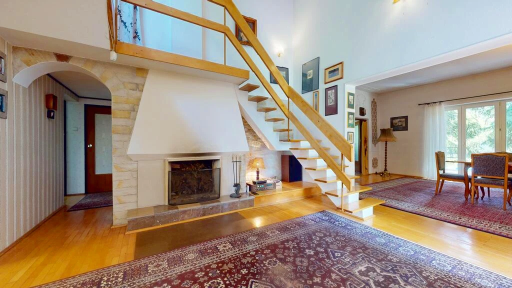 - Geräumiges Wohnzimmer mit Kamin – aufgeteilt in zwei Bereiche – und direktem Zugang zur ca. 21 m² großen Terrasse