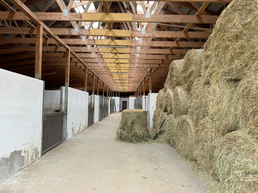 Stallausstattung: - 9 klassische Pferdeboxen (leicht demontierbar) - 2 große Boxen à ca. 30 m² - 2 Waschplätze für Pferde (mit Warm- und Kaltwasser) - Lagerflächen (ca. 60 m²) - Untersuchungsraum mit Fixierbox - 9 englische Außenboxen mit separatem Zugang und Überwachungssystem - Sattelkammer, Badezimmer, Untersuchungsraum – alle beheizt, mit Warm-/Kaltwasseranschluss