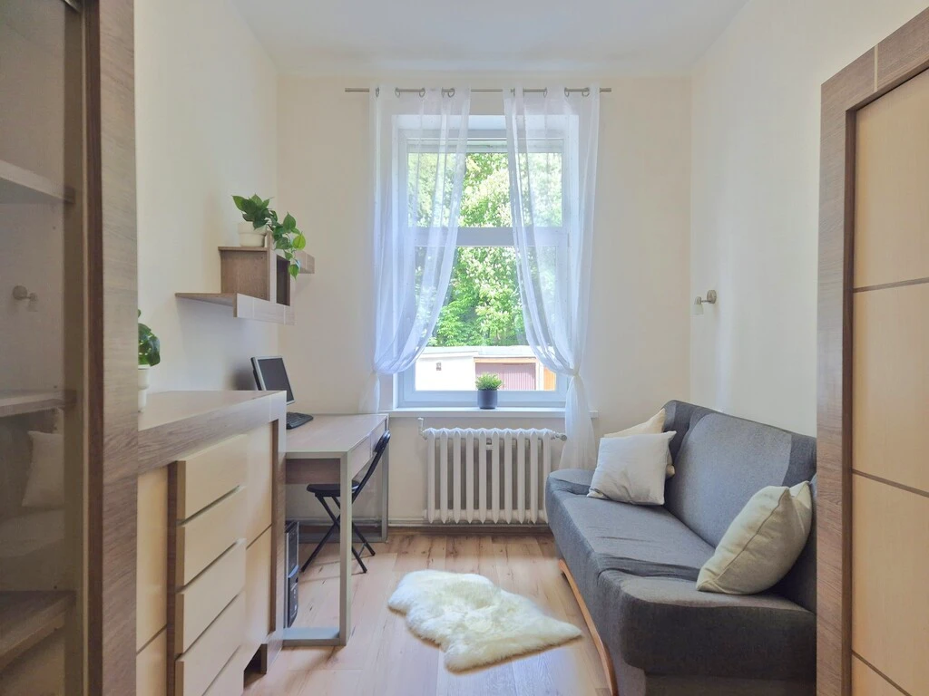 Die Wohnung liegt direkt am Chopin-Park – umgeben von Geschäften, Schulen, Spielplätzen, Grünflächen und mit hervorragender Anbindung an öffentliche Verkehrsmittel (Buslinien 2, 9, B).
