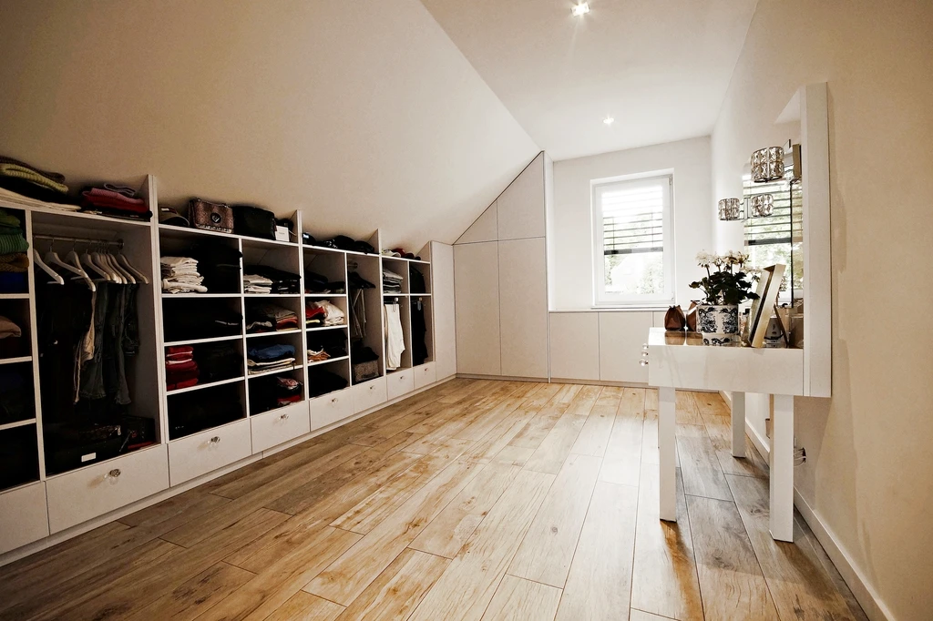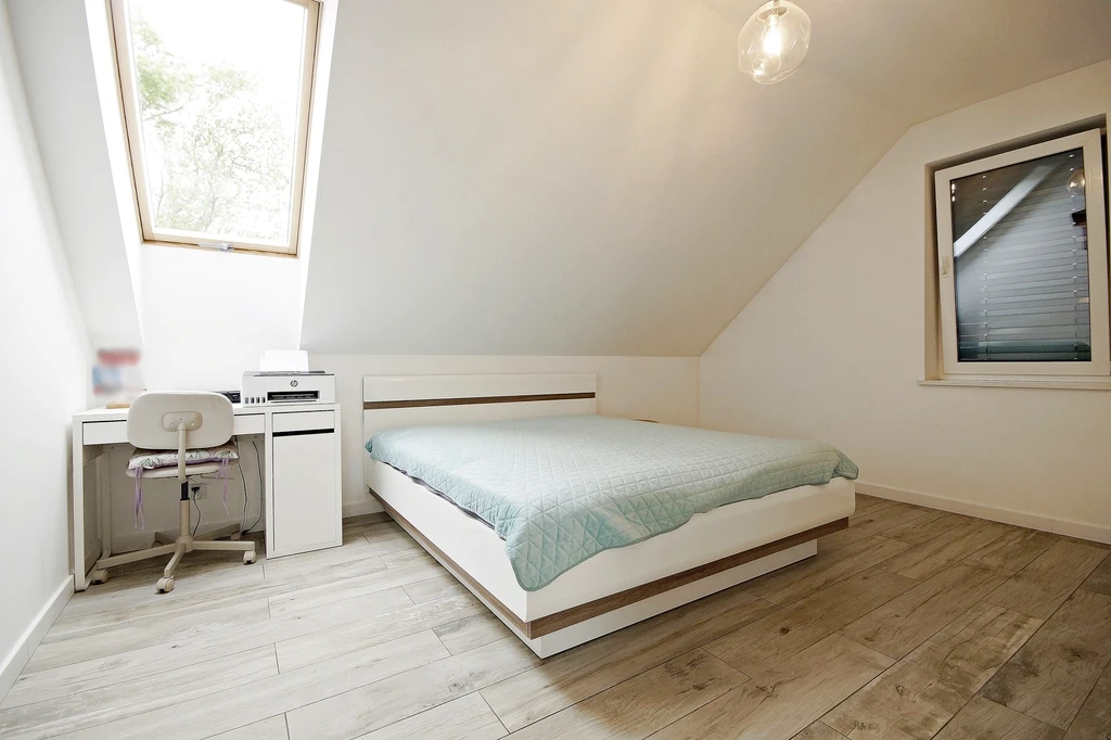 Im Obergeschoss befinden sich drei Schlafzimmer – eines wird aktuell als Ankleide genutzt – sowie ein komfortables Badezimmer mit freistehender Badewanne, WC und Waschbecken. Zusätzlich gibt es einen zugänglichen Dachbodenbereich, der als Stauraum dient.