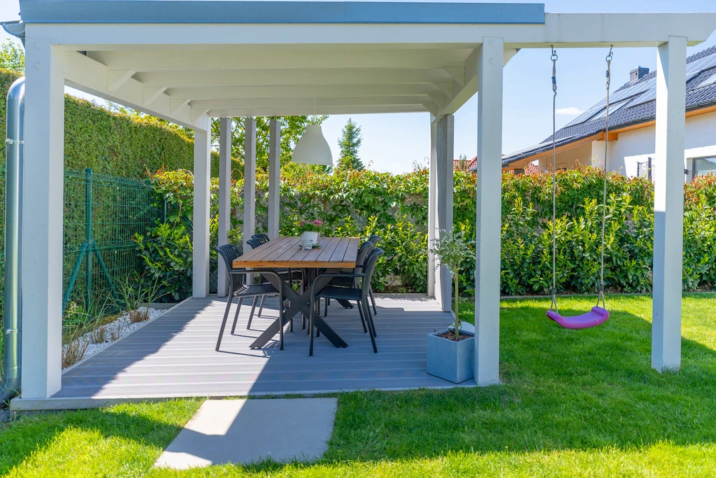 - Garten mit Holzpavillon und praktischem Gerätehaus