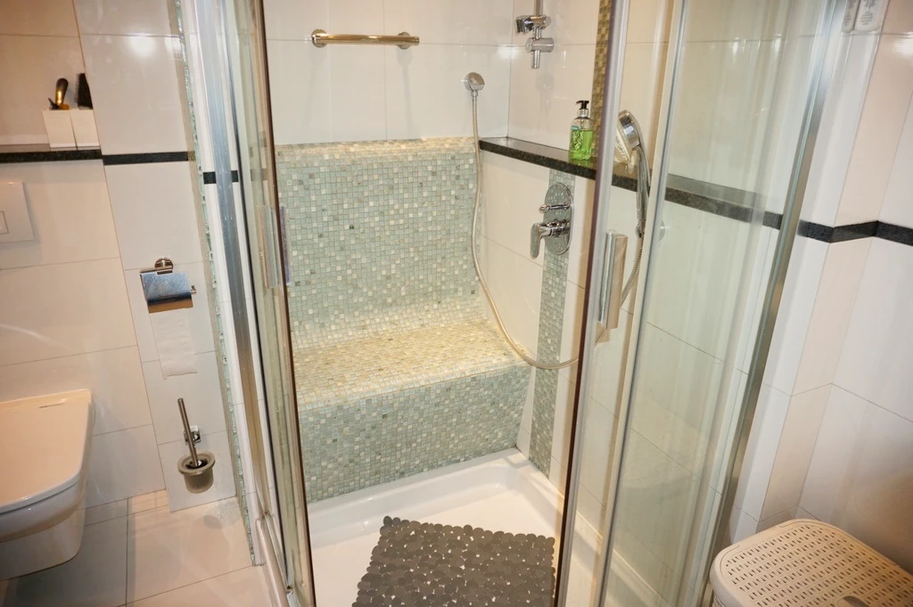 - Zweites Badezimmer mit Dusche (inkl. Sitzbank), ebenfalls modern gefliest