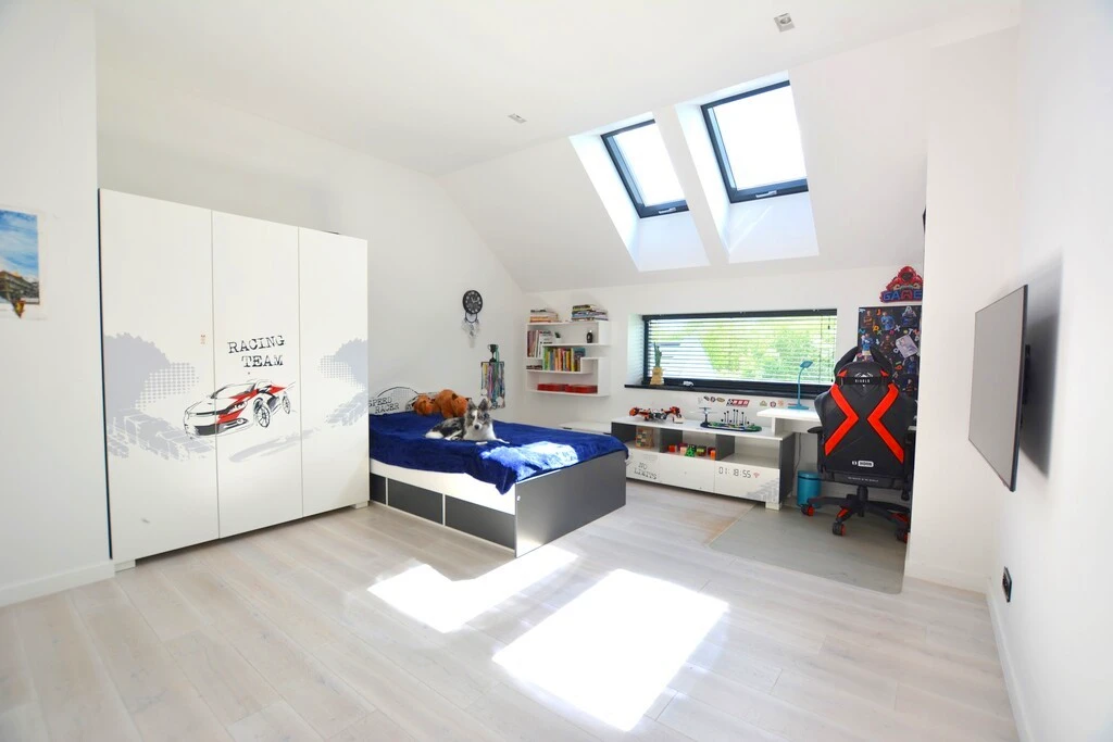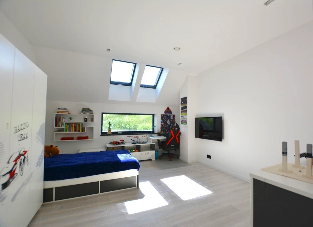 Die obere Etage beeindruckt mit einer luxuriösen Elternsuite: ein Schlafzimmer (19,51 m²) mit eigenem Badezimmer (14,92 m²), ausgestattet mit Badewanne, Dusche, Bidet, WC und Fenster. Zwei weitere großzügige Schlafzimmer (20,41 und 18,19 m²) bieten vielfältige Möglichkeiten für Familie oder Gäste. Ebenfalls vorhanden ist ein weiteres hochwertig ausgestattetes Badezimmer (5,29 m²) und eine praktische Ankleide.