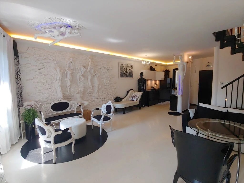 Ein Highlight im Wohnzimmer sind eine kunstvolle Wandgestaltung mit Skulpturen und hochwertige Bodenbeläge – elegante Paneele und glatte, frisch gestrichene Wände sorgen für ein stilvolles Ambiente.