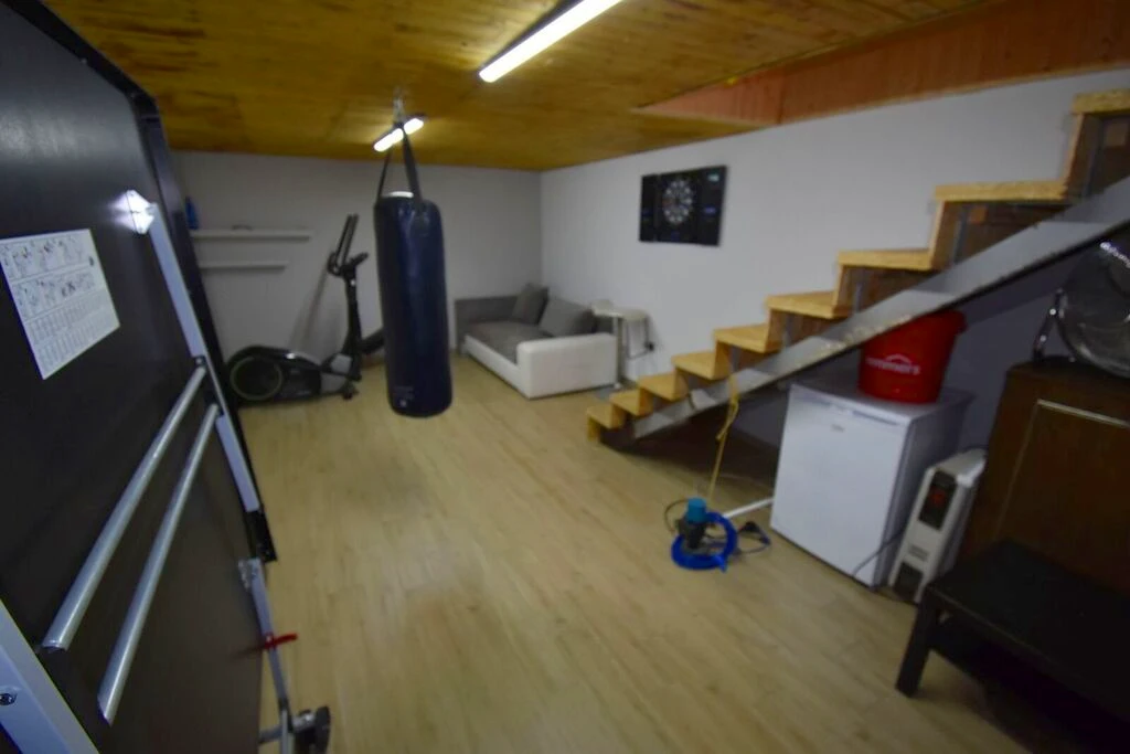 - Rekreative Unterkellerung mit ca. 30 m²: Ideal für Ping-Pong, Darts, Fitnessgeräte (z. B. Ergometer und Trainingsbank). Integriert ist eine eigene Tiefbrunnenanlage sowie Installationen für einen Kamin.