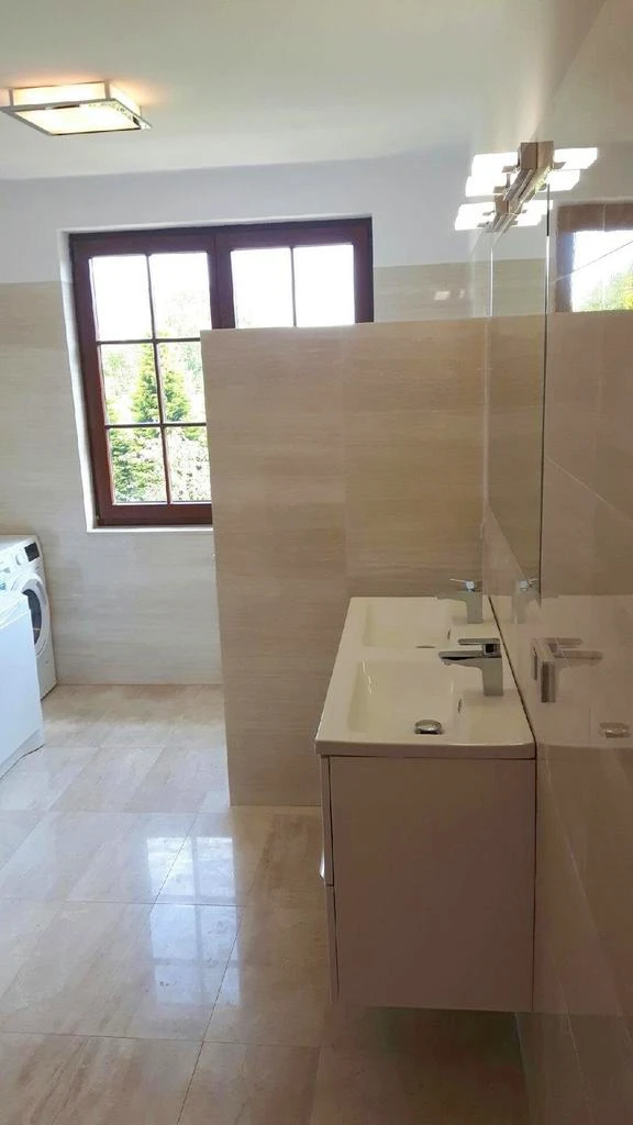 Im Erdgeschoss befinden sich großformatige, geschliffene Feinsteinzeugfliesen auf ca. 90 m². Küche, Bäder und WC sind hochwertig verfließt. Teilweise sind die Innenräume bereits gestrichen (Küche mit Essbereich, Garderobe, Flur sowie zwei Zimmer der abgetrennten Einheit). Massivholztreppen aus Buchenholz führen ins Obergeschoss.