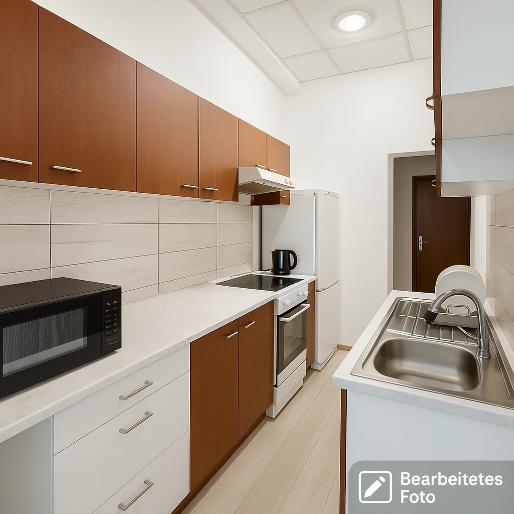 - Separate Küche mit Backofen, Kühlschrank und Mikrowelle