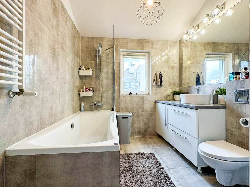 - Badezimmer mit Fenster, Badewanne, Waschbecken, WC und Waschmaschine