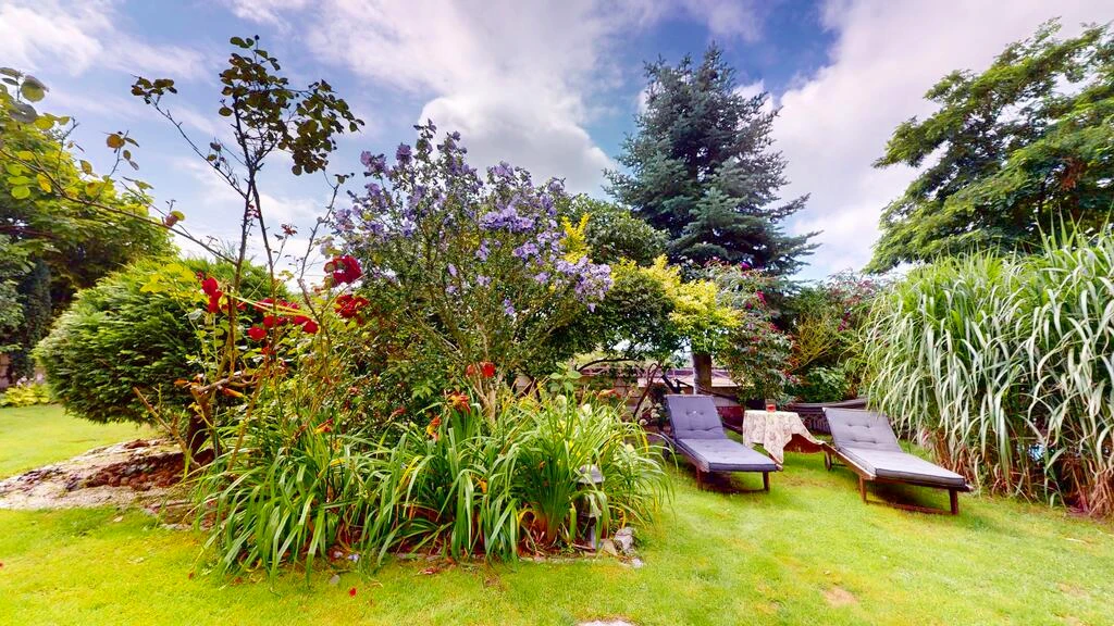 Das liebevoll angelegte Grundstück begeistert mit vielfältiger Bepflanzung, einem Zierteich, romantischen Gartenwegen sowie einem vollautomatisierten Bewässerungssystem. Ein echtes Highlight ist das separate Gästehaus mit Wohnbereich, Küche, zwei Schlafzimmern und Bad mit WC – perfekt für Familie, Freunde oder als Ferienunterkunft.