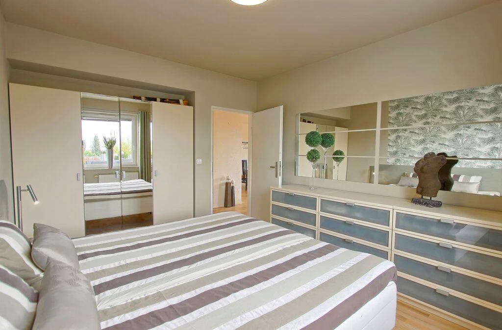- Schlafzimmer mit einem komfortablen Doppelbett und viel Stauraum in Einbauschränken und Kommode