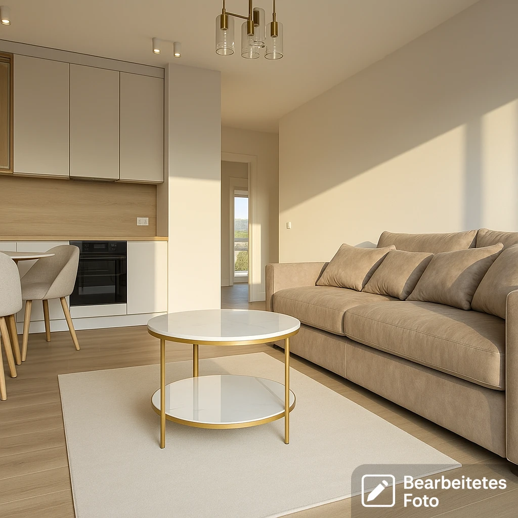 Die Innenräume wurden mit viel Liebe zum Detail gestaltet – moderne Beleuchtung, durchdachtes Raumkonzept, hochwertige Materialien und goldene Akzente schaffen eine harmonische Atmosphäre.