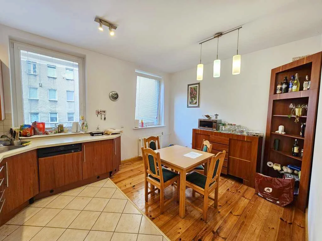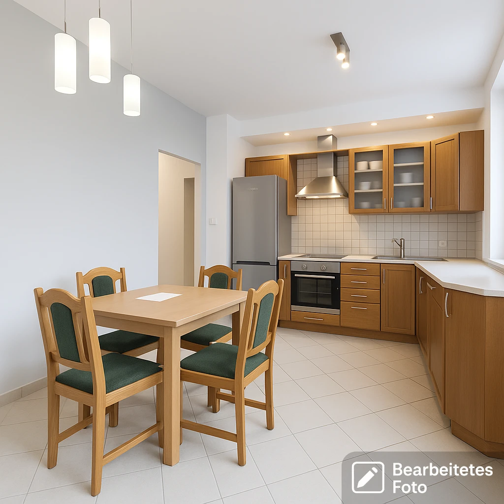 - Große, voll ausgestattete Küche mit Fenster und Platz für einen Esstisch – inkl. Kühlschrank, Geschirrspüler, Backofen.
