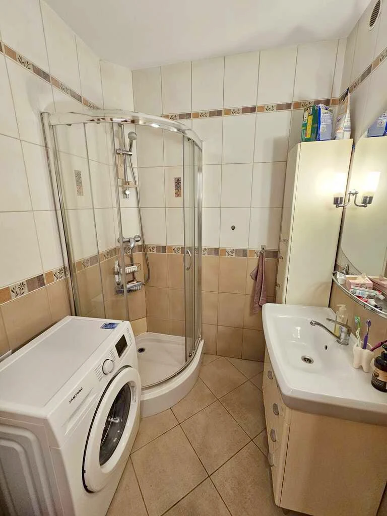 - Modernes Badezimmer mit Dusche, Waschbecken und Waschmaschine – geschmackvoll gefliest.