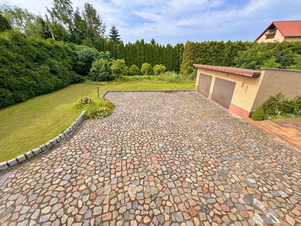 Ein Highlight ist die separate, massive Doppelgarage mit ca. 40 m² Fläche sowie zwei Terrassen: eine geräumige untere Terrasse (ca. 35 m²) und eine überdachte obere Terrasse (ca. 14 m²) – perfekt für entspannte Stunden im Freien.