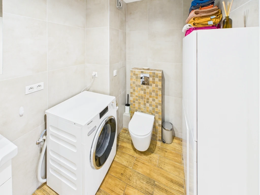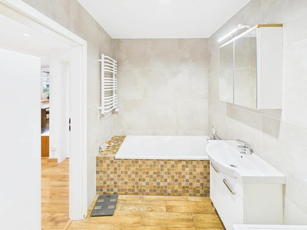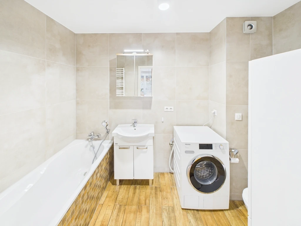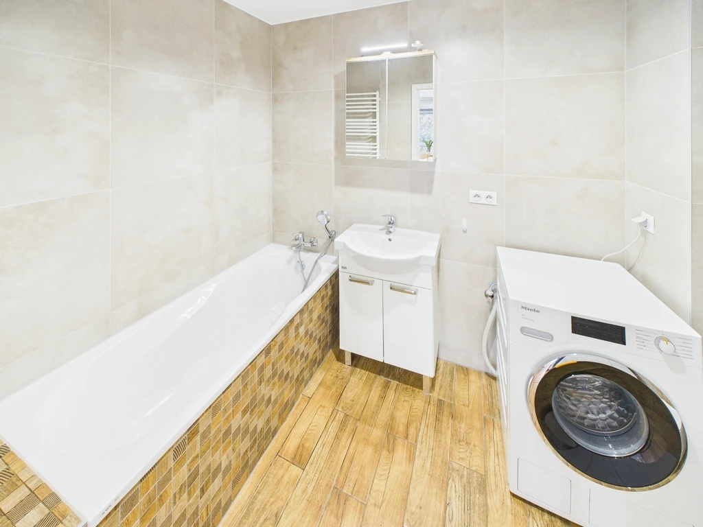 - Badezimmer mit Badewanne, Waschbecken, WC, Waschmaschine und Handtuchheizkörper