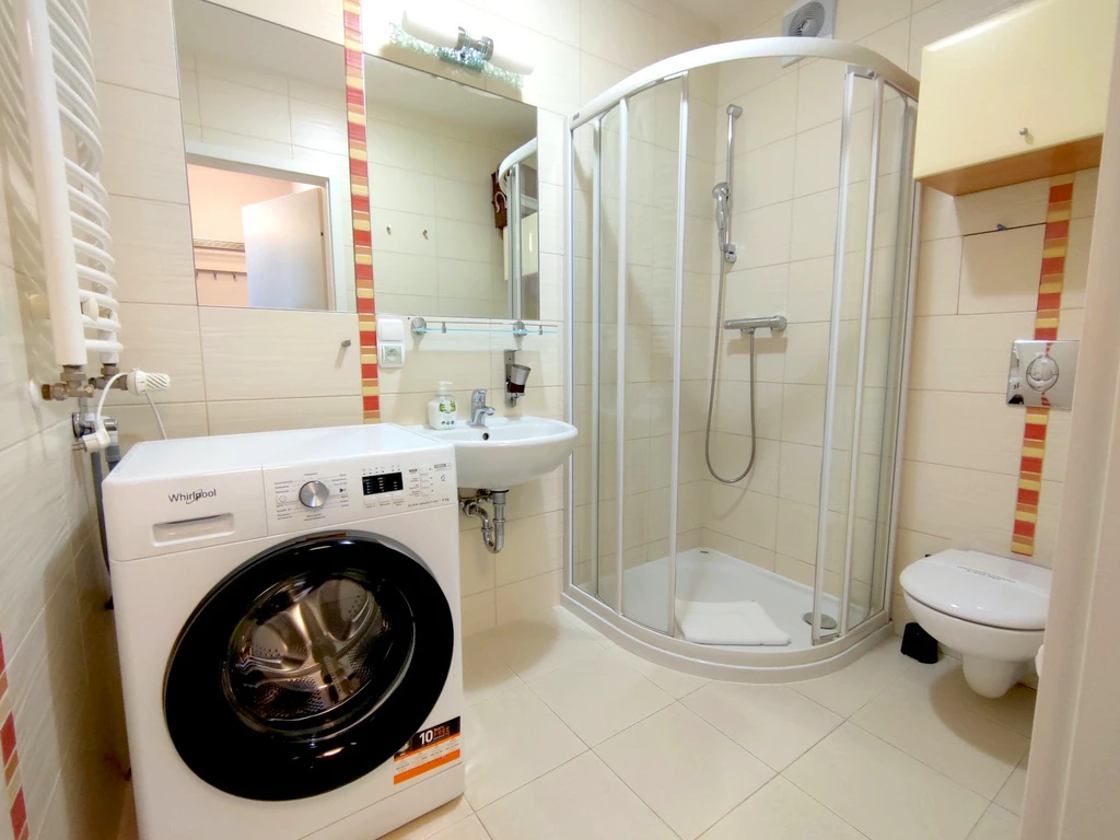 - Badezimmerausstattung: Waschbecken, Dusche, Handtuchheizkörper, WC