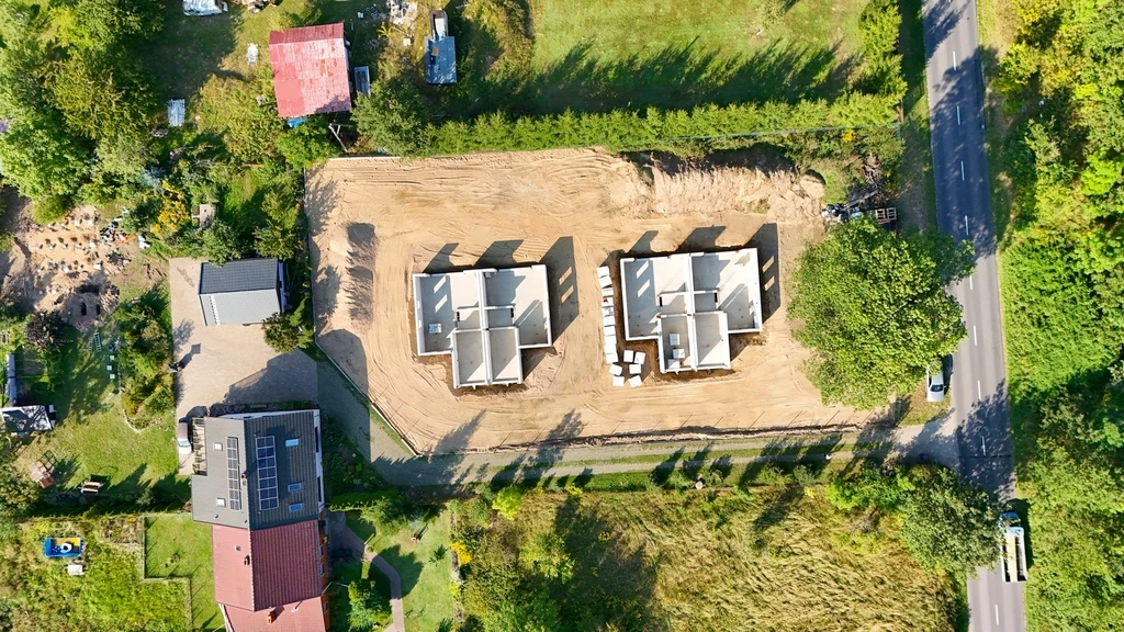 Auf dem großzügigen, 2.142 m² großen Grundstück wurde mit dem Bau von vier modernen Doppelhaushälften begonnen. Die Immobilie ist direkt an einer Hauptstraße gelegen, was eine ausgezeichnete Erreichbarkeit und Sichtbarkeit gewährleistet.