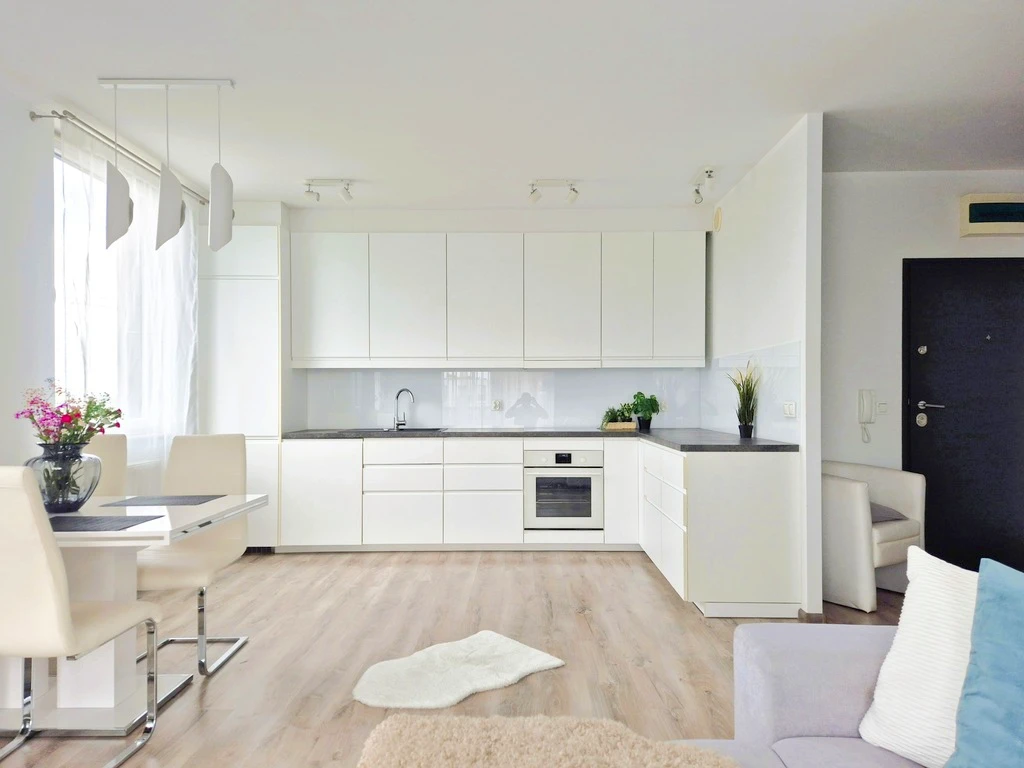 - Großes Wohnzimmer mit offener Küche und einem breiten Fenster mit Zugang zum Balkon – lichtdurchflutet und offen geschnitten