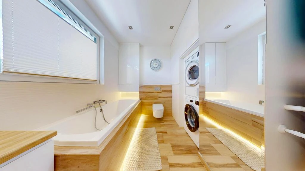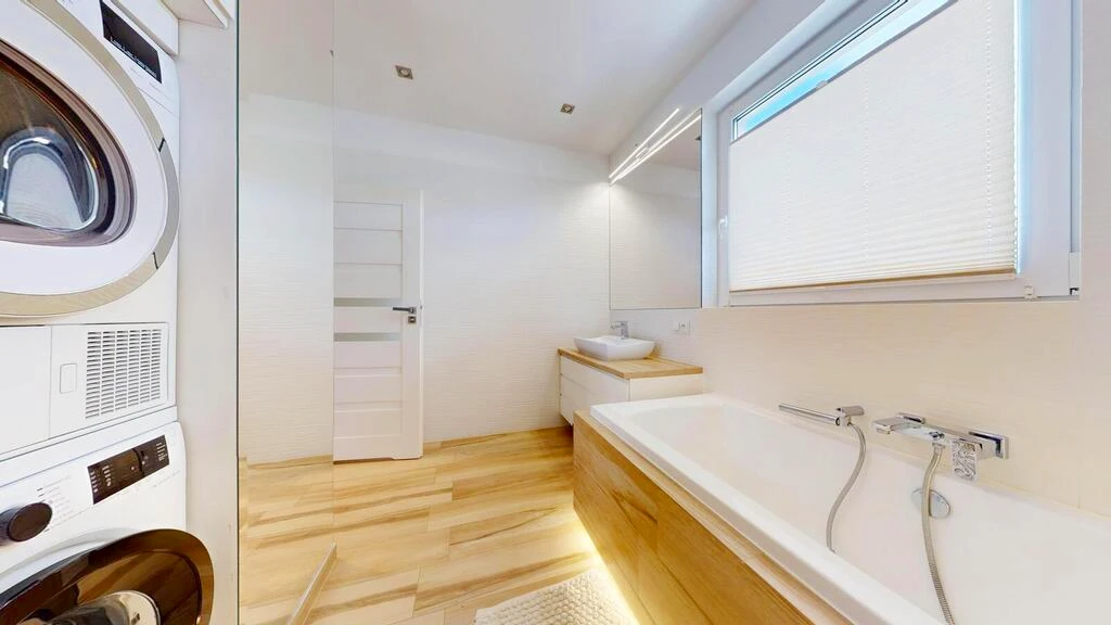 - Familienfreundliches Badezimmer (ca. 8 m²) mit Fenster, Badewanne, WC sowie stilvoller Einbaulösung für Waschmaschine und Trockner.