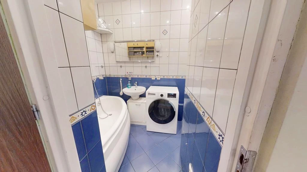 - Bad-Ausstattung: Waschbecken, WC, Waschmaschine, Dusche, Badewanne