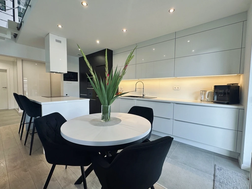 - Einbauküche mit Markengeräten: Kühlschrank, Backofen, Mikrowelle und Geschirrspüler sind bereits vorhanden