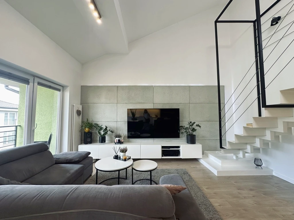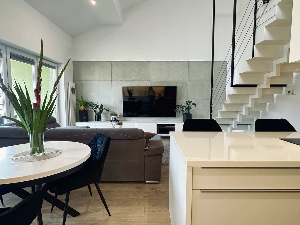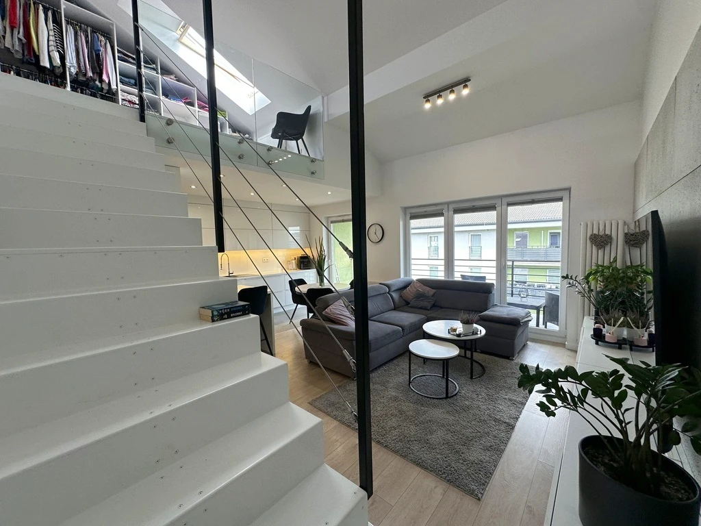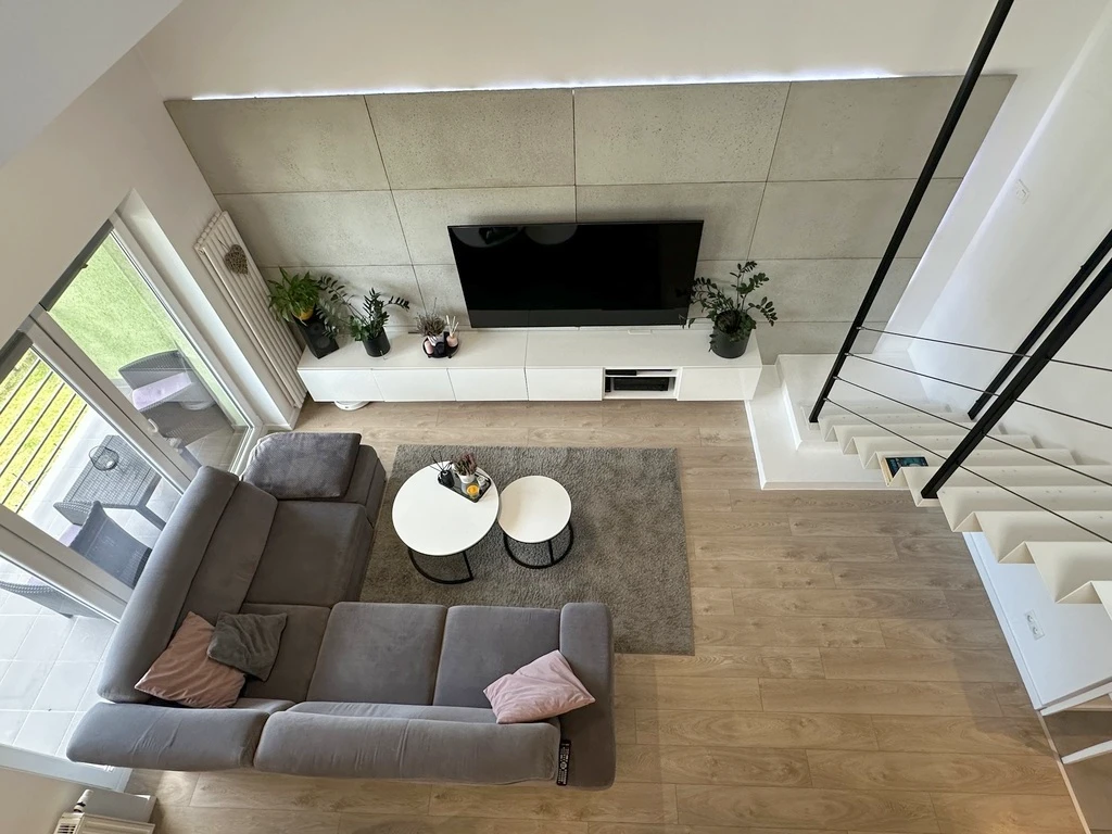Untere Ebene: - Großzügiges Wohnzimmer mit offener Küche – gemütlicher Wohnbereich mit Zugang zur östlich ausgerichteten Loggia - Zwei weitere Zimmer mit Fenstern zur Westseite – ideal als Schlafzimmer, Kinderzimmer oder Büro - Modernes Badezimmer - Flur mit großer Einbauschranklösung