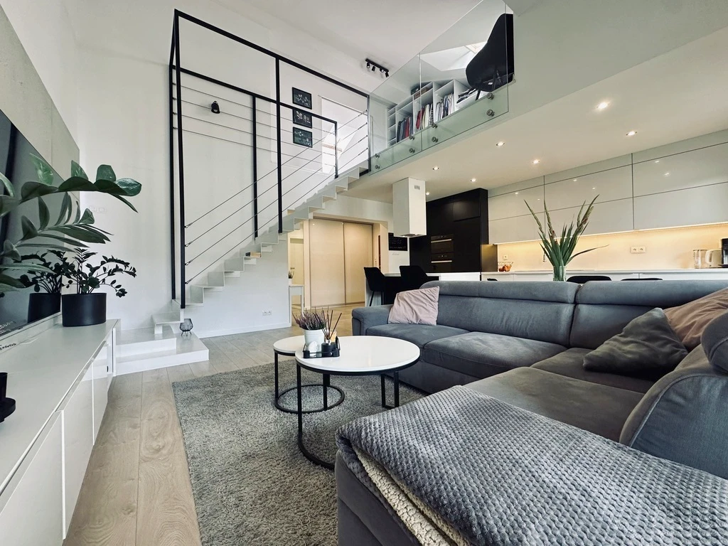 Diese helle, bezugsfertige Wohnung verteilt sich über zwei Ebenen und bietet durch die hohe Decke (5,6 m) ein besonders luftiges Raumgefühl.
