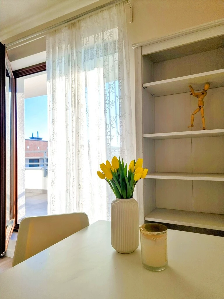 Das erste Zimmer bietet ein großes Bett, Kleiderschrank und einen Arbeitstisch. Das zweite Zimmer verfügt über ein Schlafsofa, einen Couchtisch, eine Kommode, ein Regal und einen Schreibtisch. Vom Wohnzimmer wie vom Schlafzimmer aus gelangt man auf die sonnige, geräumige Terrasse – ein perfekter Ort für Entspannung.